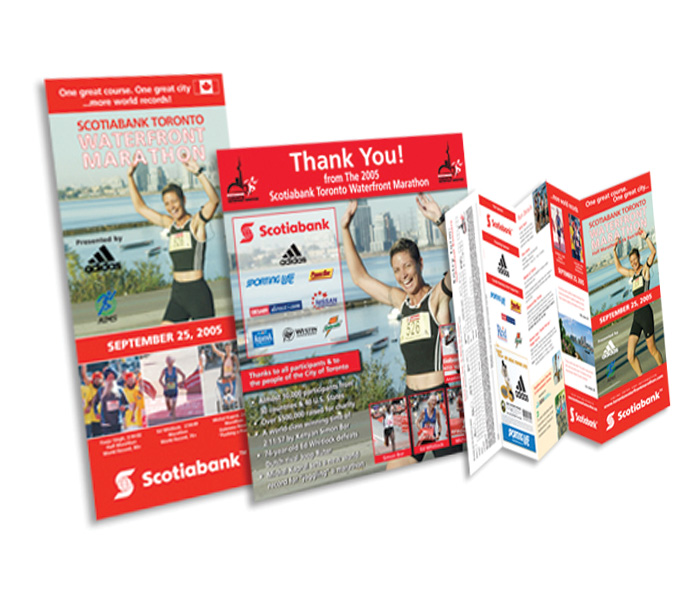 SCOTIABANK EVENT BRANDING Scotiabank Toronto Waterfront Marathon Each fall, Reid Marketing helps Scotiabank "paint the town red" at the Toronto Waterfront Marathon. Whether you're one of the 20,000+ participants, a member of the media or just a supporter, it's hard not to notice the massive Scotiabank branding along virtually every step of the marathon route, start/finish, expo, and party area. Let us do the same for your event! Visit our event support site at www.marathonsupplies.com |
